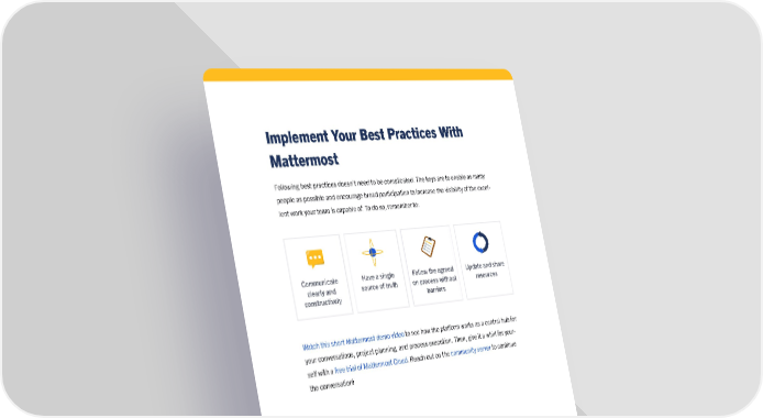 8 Best Practices for Software Development with Mattermost Implement Your Best Practices With Mattermost Following best practices doesn’t need to be complicated. The keys are to enable as many people as possible and encourage broad participation to increase the visibility of the excel - lent work your team is capable of. To do so, remember to: Communicate clearly and constructively Have a single source of truth Follow the agreed on process without barriers Update and share resources Watch this short Mattermost demo video to see how the platform works as a central hub for your conversations, project planning, and process execution. Then, give it a whirl for your - self with a free trial of Mattermost Cloud . Reach out on the community server to continue the conversation!