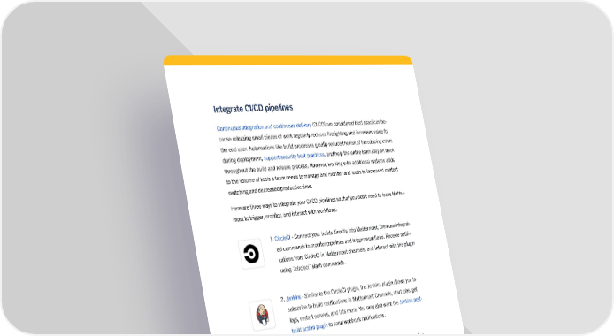 7 Best Practices for Software Development with Mattermost Integrate CI/CD pipelines Continuous integration and continuous delivery (CI/CD) are considered best practices be - cause releasing small pieces of work regularly reduces firefighting and increases value for the end user. Automations like build processes greatly reduce the risk of introducing errors during deployment, support security best practices , and help the entire team stay on track throughout the build and release process. However, working with additional systems adds to the volume of tools a team needs to manage and monitor and leads to increased context switching and decreased productive time. Here are three ways to integrate your CI/CD pipelines so that you don’t need to leave Matter - most to trigger, monitor, and interact with workflows: 1. CircleCI - Connect your builds directly into Mattermost, then use integrat - ed commands to monitor pipelines and trigger workflows. Receive notifi - cations from CircleCI in Mattermost channels, and interact with the plugin using `/circleci` slash commands. 2. Jenkins - Similar to the CircleCI plugin, the Jenkins plugin allows you to subscribe to build notifications in Mattermost Channels, start jobs, get logs, restart servers, and lots more. You may also want the Jenkins post- build action plugin to send webhook notifications. 3. GitLab CI/CD - Include notifications about your GitLab pipelines using the Mattermost GitLab plugin to subscribe. This plugin includes a host of GitLab integration features for two-way communication with Mattermost. Run `/gitlab help` in Mattermost for more details. 4. Find more CI/CD plugins for Mattermost in the Marketplace