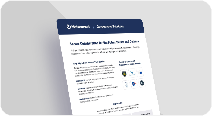 Stay Aligned and Achieve Your Mission Government agencies are under constant pressure to do more with less. Mission-oriented organizations need innovative ideas, teamwork, and alignment around shared goals. Mattermost is an open source collaboration platform that addresses key industry challenges with: EFFICIENCY: New tools and processes to increase efficiency and modernize digital operations SECURITY: Communicate and collaborate securely across departments, agencies, and contractors with on-premise and secure cloud deployment options INNOVATION: Adopt modern practices for agile software development and IT operations Key Benefits Mattermost aligns teams, tools, and processes with frictionless collaboration - a command and control center that can be adapted to workflows of any type. Trusted by Government Organizations Around the Globe Secure Collaboration for the Public Sector and Defense A single platform for governments worldwide to securely communicate, collaborate, and manage operations - from public agencies to defense and intelligence organizations. Government Solutions Align teams, tools, and process Connect geographically distributed team members, tools, and mission-critical processes. Data sovereignty & security Stay in complete control over your data. Deploy on-premise or in a private cloud. Employ granular access controls and secure guest accounts. Modernize operations Transform the way your teams communicate, collaborate, and operate with digital processes that scale. Efficiently execute prescribed processes Customizable Playbooks with checklist-based processes, integrated collaboration, and stakeholder communication. Improve agility and delivery Help development teams ship better code faster with solutions designed for modern, agile processes. Incident resolution Fix mission-critical issues fast with modern automation, runbook automation, debrief tools, and more.
