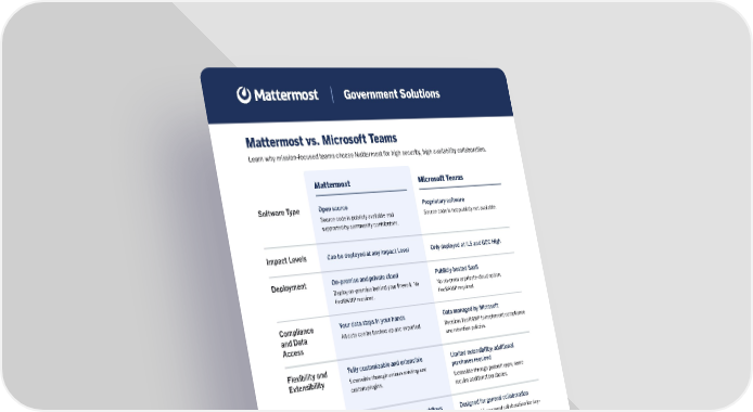 Mattermost vs. Microsoft Teams Learn why mission-focused teams choose Mattermost for high security, high availability collaboration. Mattermost Software Type Deployment Compliance and Data Access Flexibility and Extensibility Usability Mobile Impact Levels Open source On-premise and private cloud Your data stays in your hands Fully customizable and extensible Designed for technical team workflows Customizable Can be deployed at any Impact Level Source code is publicly available and supported by community contributors. Deploy on-premise behind your firewall. No FedRAMP required. All data can be backed up and exported. Extensible through various existing and custom plugins. Best suited for developers and mission- focused team collaboration. Proprietary software Publicly-hosted SaaS Data managed by Microsoft Limited extensibility; additional purchases required Designed for general collaboration Not customizable Only deployed at IL5 and GCC High Source code is not publicly not available. No on-prem or private-cloud option. FedRAMP required. Requires FedRAMP to implement compliance and retention policies. Extensible through prebuilt apps; some require additional purchases. Best suited for general collaboration for day- to-day activities. Microsoft Teams Government Solutions Choose your deployment option Unite your people, tools, and processes. Secure, open-source, and made for developers. Get started for free with Mattermost Cloud or Self-Hosted ยป Supports chat and voice calls (beta) for a single server, no plugins or file management. Customize via API. Video calls, calendar views, chat, integrated cloud storage, dashboards, support for multiple team accounts, etc. No ability to customize the mobile app.