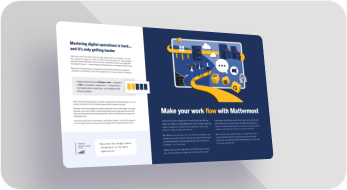 func (a * App) CreateChannel (c * request.Context, channel * model.Channel, addMember bool) (*model.Channel, *model.AppError) { channel.DisplayName = strings. TrimSpace (channel.DisplayName) sc , nErr := a. Srv().Store. Channel (). Save (channel, * a. Config ().TeamSettings.MaxChannelsPerTeam) if nErr != nil { var invErr * store.ErrInvalidInput var cErr * store.ErrConflict var ltErr * store.ErrLimitExceeded var appErr * model.AppError switch { case errors. As (nErr, & invErr): switch { case invErr.Entity == "Channel" && invErr.Field == "DeleteAt" : return nil , model. NewAppError ( "CreateChannel" , "store.sql_channel.save.archived_channel.app_error",ni l, "", http.StatusBadRequest) case invErr.Entity == "Channel" && invErr.Field == "Type" : return nil , model. NewAppError ( "CreateChannel" , "store.sql_channel.save.direct_channel.app_error", nil, "", http. StatusBadRequest) case invErr.Entity == "Channel" && invErr.Field == "Id" : return nil , model. NewAppError ( "CreateChannel" , "store.sql_channel.save_channel.existing.app_error",nil,"i d="+invErr.Value.(string),http.StatusBadRequest) } case errors. As (nErr, & cErr): return sc, model. NewAppError ( "CreateChannel" , store.ChannelExistsError, nil, cErr.Error(), http.StatusBadRequest) case errors. As (nErr, & ltErr): return nil , model. NewAppError ( "CreateChannel" , "store.sql_channel.save_channel.li mit.app_error",nil,ltErr.Error(),http.StatusBadRequest) case errors. As (nErr, & appErr): // in case we haven't converted to plain error. return nil ,appErr default : // last fallback in case it doesn't map to an existing app error. return nil , model. NewAppError ( "CreateChannel" , "app.channel.create_channel.internal_er ror", nil, nErr.Error(), http.StatusInternalServerError) } } Mastering digital operations is hard... and it’s only getting harder R&D teams continue to lead the shift to the agile, digital enterprise, but doing so is no easy feat. Companies recognize the critical role that these developers play. Still, mastering digital operations requires alignment across teams, tools, and processes across each stage of the development lifecycle — from planning and building software to releasing and maintaining it. But most of the existing tools are fragmented and siloed, while workflows are fragile and developers are frustrated by friction and misalignment. The numbers speak for themselves: Add to this the mounting pressure of incidents, emergencies, and shifting priorities, and it’s no wonder that fewer than 18% of software leaders say their teams are truly agile. Developers have tried using general-purpose collaboration tools to stitch together their digital operations, but it hasn’t worked. Constant workarounds lead to fragile processes and siloed data that keeps teams from optimizing production efforts while pulling resources away from development work. These tools simply lack the customization, extensibility, integration, and security required to unite the people with the processes and technologies modern development teams rely on. Make your work flow with Mattermost Unlike other solutions, Mattermost is explicitly built for R&D use cases. Our platform brings together team communication, task and project management, and workflow orchestration into a unified platform for agile software development. With Mattermost, developers can communicate, collaborate, and operate across tools and teams. We help you stay productive and collaborate outside of code by aligning your tools, people, and processes — all in one place. Mattermost has deep integrations with the tools you use every day, providing you with a single point of collaboration, so you have greater visibility and control of your team’s work. We provide open access to our source code, so your team has the power to customize solutions based upon their specific use cases, as well as playbooks and automation that you can define and adapt. We’re also the only solution that offers self-hosted and secure cloud deployment options so that you always have complete control over your data to meet the strictest security, privacy, and compliance requirements. Research shows that up to 16 hours a week — equivalent to 39% of a developer’s salaried time — is wasted due to tool fragmentation, manual tasks, and managing weakly defined workflows. “ Mattermost has brought modern c ollaboration to the whole organization.” David Rowe Manager of IT Systems Support