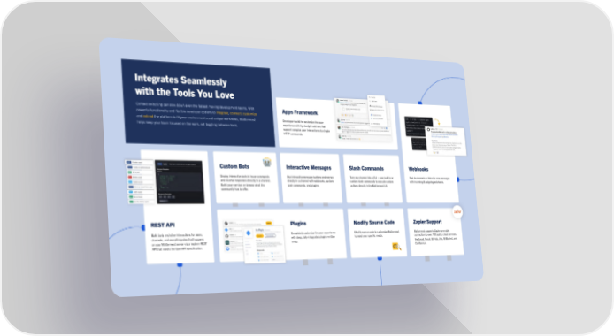 Integrates Seamlessly with the Tools You Love Context switching can slow down even the fastest moving development teams. With powerful functionality and flexible developer options to integrate , connect , customize and extend the platform to fit your environments and unique workflows, Mattermost helps keep your team focused on the work, not toggling between tools. Apps Framework Interactive Messages Plugins REST API Slash Commands Modify Source Code Custom Bots Webhooks Zapier Support Developer toolkit to customize the user experience with lightweight add-ons that support complex user interactions via simple HTTP commands. Use interactive message buttons and menus directly in a channel with webhooks, custom slash commands, and plugins. Completely customize the user experience with deep, fully-integrated plugins written in Go. Build bots and other interactions for users, channels, and everything else that happens on your Mattermost server via a modern REST API that meets the OpenAPI specification. Turn any channel into a CLI — use built-in or custom slash commands to execute custom actions directly in the Mattermost UI. Modify source code to customize Mattermost to meet your specific needs. Deploy interactive bots to issue commands and receive responses directly in a channel. Build your own bot or browse what the community has to offer. Post to channels or listen for new messages with incoming & outgoing webhooks. Mattermost supports Zapier to enable connection to over 700 public cloud services, like Email, Gmail, GitHub, Jira, BitBucket, and Confluence.