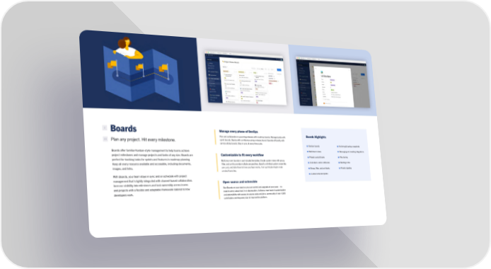 Boards offer familiar Kanban-style management to help teams achieve project milestones and manage projects and tasks of any size. Boards are perfect for tracking tasks for sprints and features in roadmap planning. Keep all every resource available and accessible, including documents, images, and links. With Boards, your team stays in sync and on schedule with project management that’s tightly integrated with channel-based collaboration. Increase visibility into milestones and task ownership across teams and projects with a flexible and adaptable framework tailored to how developers work. Boards Plan any project. Hit every milestone. Boards Highlights Kanban boards Multi-team views Project cards & tasks Unlimited custom attributes Group, filter, and sort tasks Customizable templates Archiving & backup snapshots Messaging and meeting integrations File sharing Meeting notes Priority labeling Manage every phase of DevOps Plan and collaborate on upcoming releases with roadmap boards. Manage builds with sprint boards. Deploy with confidence using a release board. Operate efficiently with service status boards. Stay in sync at every time scale. Open source and extensible Run Boards on your stack so you can control and upgrade at your pace – no need to worry about lock-in or deprecation. Achieve a new level of customization and extensibility with access to source code and join a community of over 4,000 contributors working every day to improve the platform. Customizable to fit every workflow Build your own boards or use included templates. Create custom views with group, filter, and sort to provide multiple perspectives. Specify unlimited custom properties per card, and tailor them to how your team works, from sprint planning to major product launches. # ##