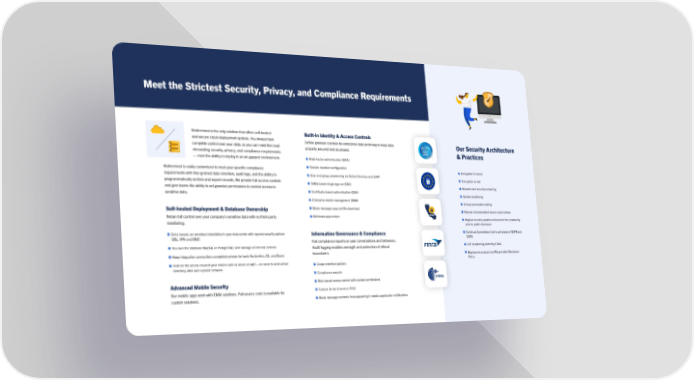Our Security Architecture & Practices Encryption in transit Encryption at rest Network and security hardening System monitoring Annual penetration testing Manual and automated source code reviews Regular security updates delivered to the community p rior to public disclosure Continual Commitment to the principles of GDPR and C CPA CVE Numbering Authority (CNA) Bug bounty program and Responsible Disclosure Po licy Meet the Strictest Security, Privacy, and Compliance Requirements Mattermost is the only solution that offers self-hosted and secure cloud deployment options. You always have complete control over your data, so you can meet the most demanding security, privacy, and compliance requirements — even the ability to deploy in an air-gapped environment. Mattermost is easily customized to meet your specific compliance requirements with fine-grained data retention, audit logs, and the ability to programmatically archive and export records. We provide full access controls and give teams the ability to set granular permissions to control access to sensitive data. Self-hosted Deployment & Database Ownership Retain full control over your company’s sensitive data with no third-party monitoring. Get a secure, on-premises installation in your data center with layered security options ( SSL, VPN and DMZ) You own the database (MySQL or PostgreSQL) and manage all internal controls Keep integration connections completely private for tools like Jenkins, Git, and Zoom Host on the secure cloud of your choice such as Azure or AWS – no need to send Active D irectory data over a public network Advanced Mobile Security Our mobile apps work with EMM solutions. Full source code is available for custom solutions. Built-in Identity & Access Controls Define granular controls for enterprise data archiving to keep data properly secured and accessed. Multi-factor authentication (MFA) Session duration configuration User and group provisioning via Active Directory and LDAP SAML-based single sign-on (SSO) Certificate-based authentication (CBA) Enterprise mobile management (EMM) Block message copy and file download Minimum app version Information Governance & Compliance Pull compliance reports on user conversations and behaviors. Audit logging enables oversight and protection of ethical boundaries. Global retention policies Compliance exports Role-based access control with custom permissions Custom terms of service (TOS) Block message contents from appearing in mobile application notifications