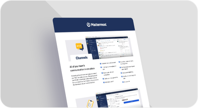 All of your team’s communication in one place Channels go beyond team messaging to connect your R&D tools and processes. Channels are built specifically for developer collaboration and can be customized from the UI down to the extensions that developers rely on to work effectively. Playbooks make any structured processes repeatable and predictable using checklists, triggers, automation, and tool integrations. Use templates to quickly codify best practices, or build a playbook from scratch with capabilities to adjust on the fly during dynamic situations. Orchestrate workflows across tools and teams Unlimited teams and channels 1:1 and group messaging and calls Native audio calls and screenshare Continuous message archive Full history search Automation, slash commands, bot integrations Rich Markdown formatting and code snippets Code syntax highlighting Use like a CLI with integrated tools Bot accounts Customizable playbooks Prescribed and ad-hoc task checklists Automated triggers & actions Deep integration with Channels Retrospective report Retrospective timeline Configurable templates Data export Status updates broadcast Reminder and countdown timer Stakeholder overview Aggregate analytics Channels Playbooks 4 Try it Now or Connect with an Expert