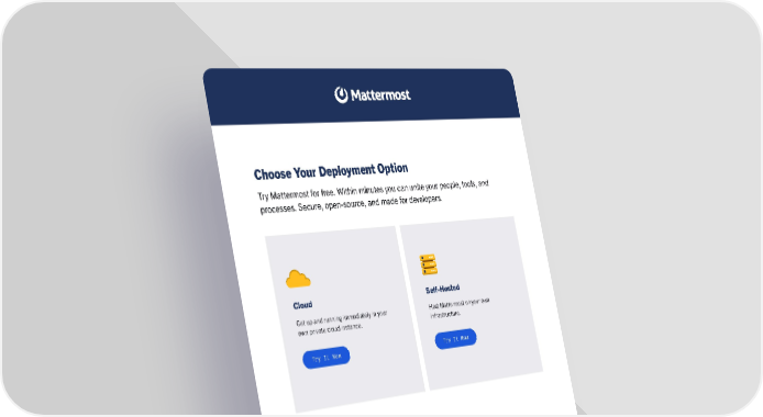 Choose Your Deployment Option Cloud Self-Hosted Get up and running immediately in your own private cloud instance. Host Mattermost on your own infrastructure. Try Mattermost for free. Within minutes you can unite your people, tools, and processes. Secure, open-source, and made for developers. Try It Now Try It Now 7