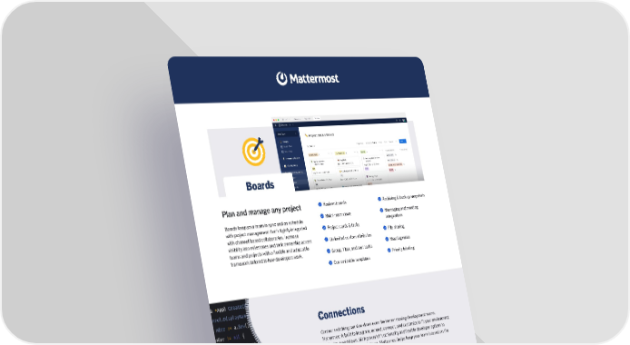 Over 600 integrations, including: Connections Context switching can slow down even the fastest moving development teams. Mattermost is built to integrate, extend, connect, and customize to fit your environment and unique workflows. With powerful functionality and flexible developer options to customize and extend the platform, Mattermost helps keep your team focused on the work, not the tools. 5 Kanban boards Multi-team views Project cards & tasks Unlimited custom attributes Group, filter, and sort tasks Customizable templates Archiving & backup snapshots Messaging and meeting integrations File sharing Meeting notes Priority labeling Apps Framework REST API Custom Bots Interactive Messages Slash Commands Webhooks Plugins Modify Source Code Zapier Support Boards Boards keep your team in sync and on schedule with project management that’s tightly integrated with channel-based collaboration. Increase visibility into milestones and task ownership across teams and projects with a flexible and adaptable framework tailored to how developers work. Plan and manage any project