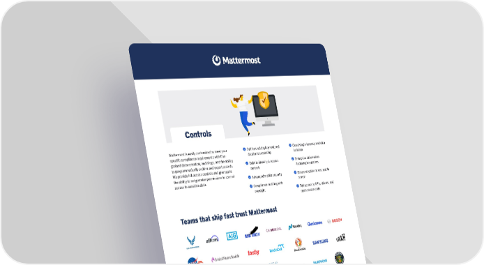 Controls “ Mattermost has been unimaginably effective for our company and continues to exceed expectations with every new release. The platform helps us ensure that we’re staying HIPAA-compliant while letting our clinicians collaborate efficiently and seamlessly.” Daniel Gover IT System Administrator Teams that ship fast trust Mattermost 6 Try it Now or Connect with an Expert Self-hosted deployment and database ownership Built-in identity & access controls Advanced mobile security Compliance auditing with oversight Cloud single-tenancy and data isolation Enterprise Information Archiving integration Data encryption at rest and in transit Full access to APIs, drivers, and open source code Mattermost is easily customized to meet your specific compliance requirements with fine- grained data retention, audit logs, and the ability to programmatically archive and export records. We provide full access controls and give teams the ability to set granular permissions to control access to sensitive data.