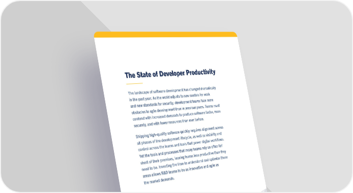 The State of Developer Productivity The landscape of software development has changed dramatically in the past year. As the world adjusts to new models for work and new standards for security, development teams face more obstacles to agile development than in previous years. Teams must contend with increased demands to produce software faster, more securely, and with fewer resources than ever before. Shipping high-quality software quickly requires alignment across all phases of the development lifecycle, as well as visibility and control across the teams and tools that power digital workflows. Yet the tools and processes that many teams rely on often fall short of their promises, leaving teams less productive than they need to be. Investing the time to understand and optimize these areas allows R&D teams to be as innovative and agile as the market demands. In This Guide In this guide, we’ll look at how the industry has changed in the past year and how these changes will impact developer teams’ productivity in 2022. We’ll share the results of a survey that focused on the challenges developers face right now. Then, we’ll dive deeper into how organizations can approach those chal - lenges to ensure that their developer teams are equipped to be highly productive, efficient, and innovative.