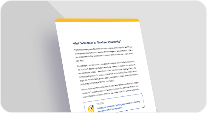 What Do We Mean by ‘Developer Productivity’? The term developer productivity comes with some baggage. Some people feel that it’s used as a way to wring every last bit of work out of a team, single out underperformers, or find a way to shoehorn all of the work on which developers spend their time into a single, achiev- able output. Productivity is a complex concept, and it doesn’t easily boil down to a single, concise met - ric. That hasn’t stopped organizations from trying, but those efforts often leave teams with one-dimensional metrics — lines of code written, features shipped, bugs squashed — that don’t adequately reflect the work that development teams are doing. Other metrics like em - ployee Net Promoter Score, product uptime, and customer retention paint a fuller picture of productivity, but can vary wildly from team to team. Because metrics can be so varied, we’ve decided not to focus on specific ones in this guide. Instead, we’ll be looking at the practices and processes that often feed into those num - bers and build the foundation of the real goal behind measuring developer productivity: Keeping your development team engaged, innovative, and building great products that they’re proud of. THE GOAL