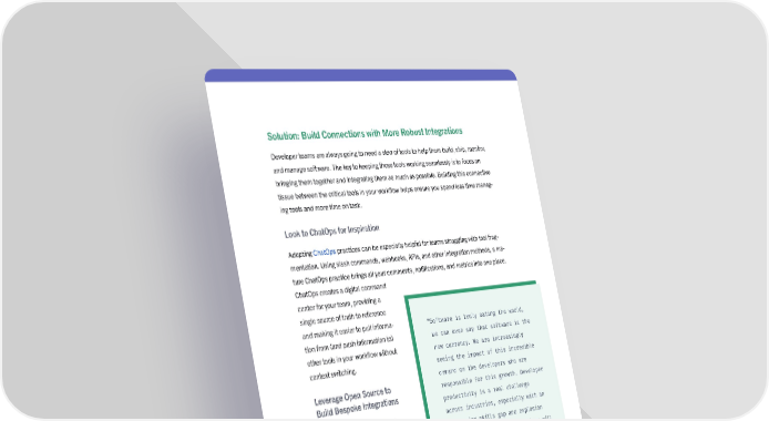 15 Mattermost | Unblock Your Workflow Solution: Build Connections with More Robust Integrations Developer teams are always going to need a slew of tools to help them build, ship, monitor, and manage software. The key to keeping those tools working seamlessly is to focus on bringing them together and integrating them as much as possible. Building this connective tissue between the critical tools in your workflow helps ensure you spend less time manag - ing tools and more time on task. Look to ChatOps for Inspiration Adopting ChatOps practices can be especially helpful for teams struggling with tool frag - mentation. Using slash commands, webhooks, APIs, and other integration methods, a ma - ture ChatOps practice brings all your comments, notifications, and metrics into one place. ChatOps creates a digital command center for your team, providing a single source of truth to reference and making it easier to pull informa - tion from (and push information to) other tools in your workflow without context switching. Leverage Open Source to Build Bespoke Integrations One of the key challenges that teams face when trying to build a more interconnected toolset is weak integrations. Out-of-the-box integrations might promise seam - less workflows but end up lacking functionality that’s essential for your team — so you end up having to go back and forth between differ - “ Software is truly eating the world, we can even say that software is the new currency. We are increasingly seeing the impact of this incredible demand on the developers who are responsible for this growth. Developer productivity is a real challenge across industries, especially with an increasing skills gap and explosion of tools. We expect organizations will look to manage this growth by unifying tools and other processes to improve productivity and results.” —Paul Nashawaty, Senior Analyst, ESG